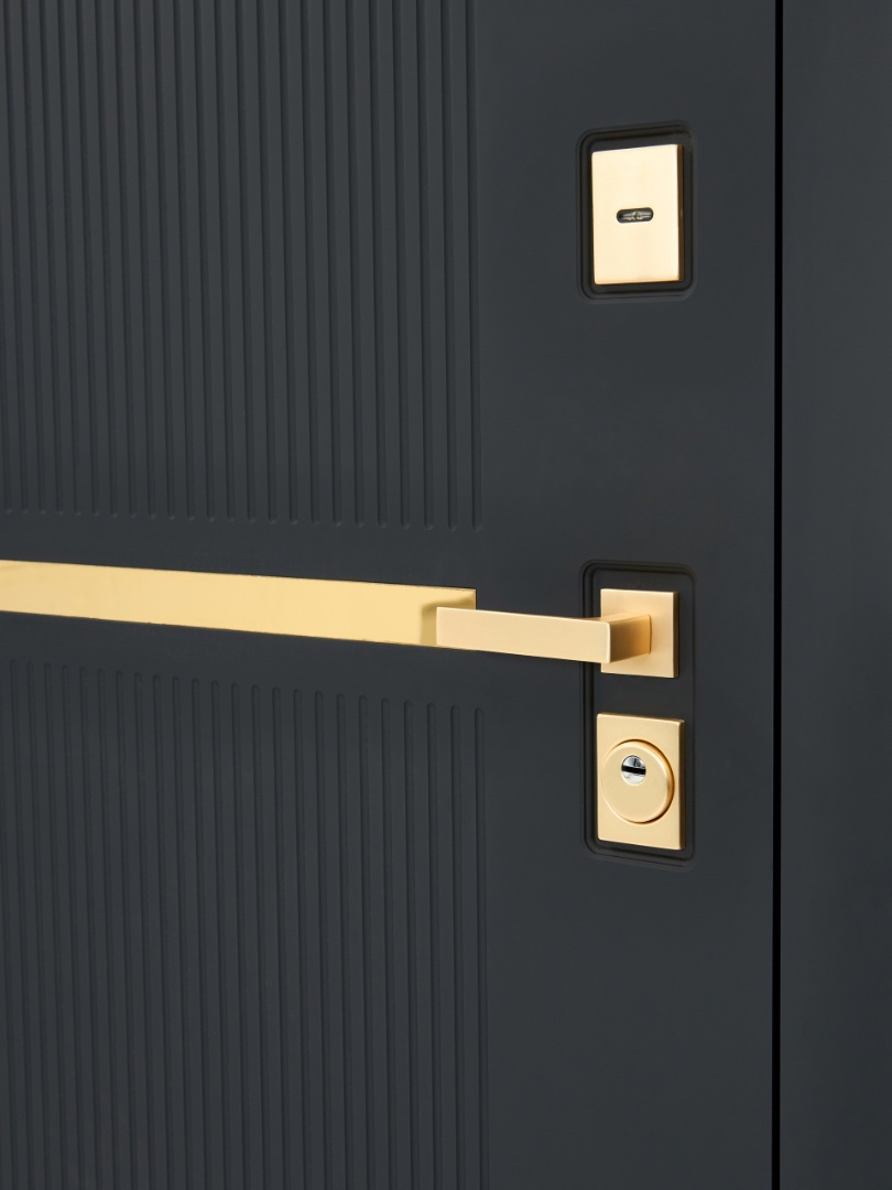 Цвет фурнитуры «квадратная золото». Цилиндр ключ-вертушка (производитель не регламентируется), регулируемый эксцентрик. Усиленная ручка. Удлиненный глазок.